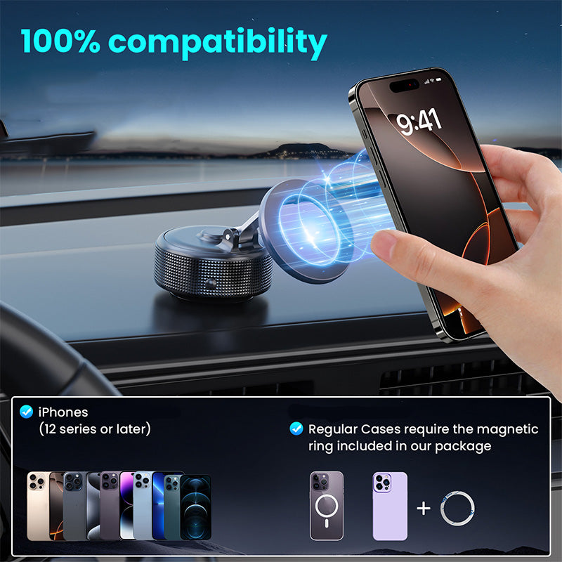 ЗДРАВ И УДОБЕН МОНТАЖ:Държателят за автомобилен телефон е снабден с автоматична вакуумна основа с мощно прилепване, която осигурява стабилно захващане върху всякакви повърхности, не само върху метал. Страничен превключвател позволява лесното му отстраняване, което улеснява настройването или преместването му.