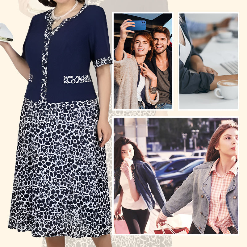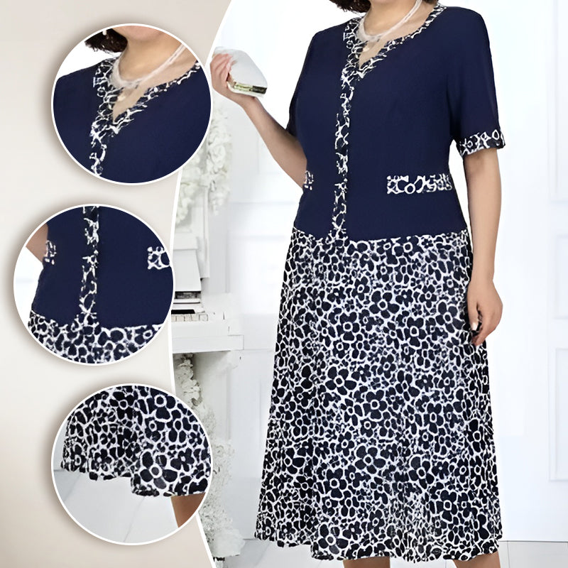 Подобно на костюм от две части, тази елегантна рокля съчетава флорална рокля с прилепнала горна част в стил жилетка за комфорт и красота.